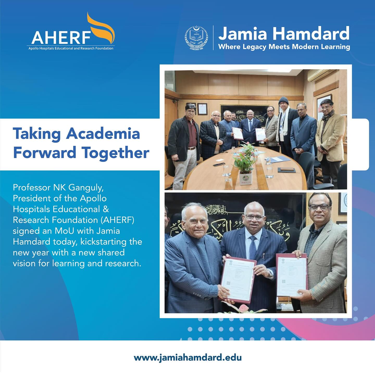 Jamia Hamdard begins the new year with an exciting collaboration! An MoU was signed with the Apollo Hospitals Educational & Research Foundation (AHERF) during the visit of Professor NK Ganguly, President of AHERF. Together, we aim to advance learning and research.