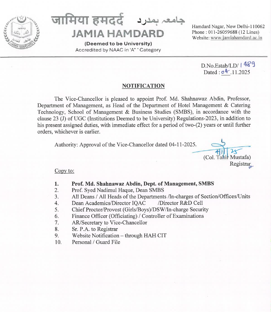 Notification regarding the appointment of Prof. Md. Shahnawaz Abdin, Professor, DMT as HoD, HMCT, SMBS October 31, 2025