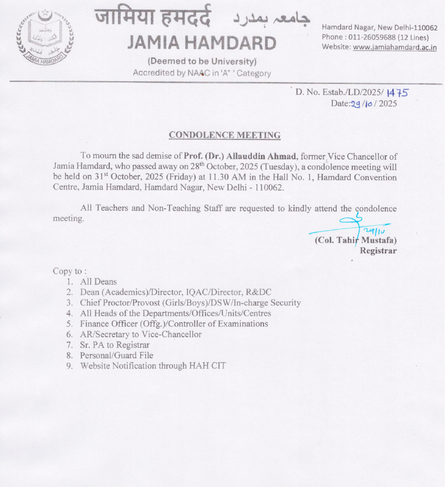 Condolence Message on the demise of Former VC, Jamia Hamdard October 27, 2025